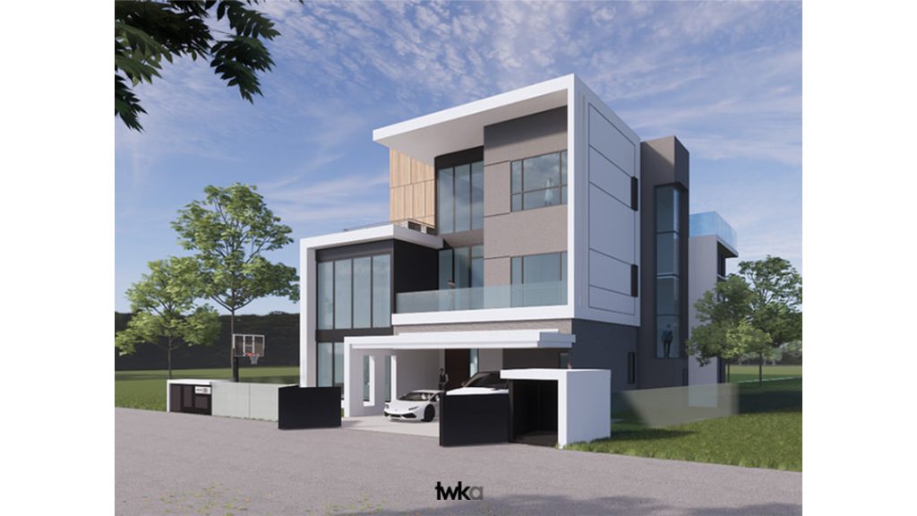 BUNGALOW, GITA BAYU, SELANGOR Design proposal for a 7000ft² bungalow at the serene Gita Bayu enclave in Selangor. The bungalow is given a contemporary “gable-roof” look accompanied by clean lines & modern materials. Internally, 2 double volume spaces were created at where the staircases are. A second exterior option was proposed that took on a modern look that emphasises on verticality with an elegant pitch roof.